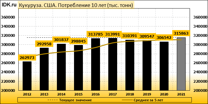 Прогноз по рынку кукурузы в США на 2021/22 год в этом месяце предусматривает компенсирующие изменения кормового и остаточного потребления, а также использования кукурузы для производства этанола, при неизменных конечных остатках. Кормовое и остаточное потребление снижено на 25 миллионов бушелей до 5,625 миллиарда на основании данных о потреблении в течение квартала с декабря по февраль. Потребление кукурузы для производства этанола повышено на 25 миллионов бушелей. С учетом компенсирующих друг друга изменений потребления конечные остатки не изменились и составляют 1,440 млрд бушелей.
