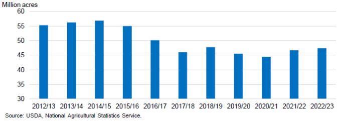 Рисунок 1. Посевные площади под всей пшеницей в США по маркетинговым годам, 2012/13 – 2022/23 гг.