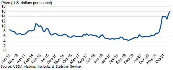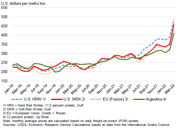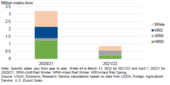 Экспорт пшеницы из США в 2021/22 году (маркетинговый год с июня по май) прогнозируется на уровне 785 миллионов бушелей, что является самым низким показателем с 2015/16 года и вторым самым низким показателем за 50 лет. Множество факторов спроса и предложения привело экспорт США к этому уровню. Ограниченные запасы в США в сочетании с высокими урожаями в некоторых странах-конкурентах привели к тому, что цена на американскую пшеницу является высокой с учетом доставки на условиях FOB. Кроме того, международные морские ставки фрахта имели тенденцию к росту из-за спроса на импорт зерна со стороны Китая и задержки загрузки судов после пандемии коронавируса (COVID-19). В совокупности более высокие цены FOB и фрахтовые ставки привели к более высоким ценам на пшеницу из Соединенных Штатов по сравнению с более дешевыми альтернативами от их конкурентов. Кроме того, конкуренты, такие как Австралия и Аргентина, географически находятся ближе, чем Соединенные Штаты, к ключевым рынкам импорта, что усугубляет и без того большую разницу в фрахте.