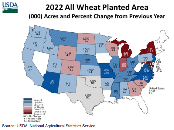 Прогнозируется, что общая площадь озимой пшеницы увеличится на 2 процента по сравнению с прошлым годом, а высокие цены осенью создадут более сильный стимул для посева. Площадь твердой краснозерной озимой пшеницы оценивается на 1 процент больше, чем в предыдущем году, а площадь мягкой краснозерной озимой — на 4 процента. Общая площадь белозерной пшеницы (озимой и яровой) прогнозируется на уровне 4,3 млн акров, что незначительно больше, чем в прошлом году. Прогноз посевной площади Hard Red Spring (HRS) сокращен на 1 процент по сравнению с предыдущим годом до 10,5 миллионов акров. Цены на HRS были высокими, но цены на многие конкурирующие культуры также выросли, и в настоящее время выращивать эти культуры более выгодно. Посевная площадь дурума оценивается в 1,9 млн акров, что представляет собой рост примерно на 17%, что обусловлено очень высокими ценами и высокой ожидаемой прибыльностью.