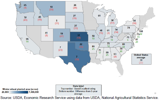 В Канзасе, крупнейшем штате, производящем озимую пшеницу, только 32 процента урожая находится в хорошем и отличном состоянии, по сравнению со средним показателем за 5 лет, равным 44 процентам. Еще более существенное ухудшение наблюдается в Техасе, Оклахоме, Колорадо и Монтане, основных штатах-производителях HRW. Состояние озимой пшеницы в штатах-производителях SRW смешанное: в большинстве штатов на юго-востоке дела обстоят лучше, чем в среднем, а в нескольких штатах, расположенных севернее, рейтинги хуже, чем обычно.