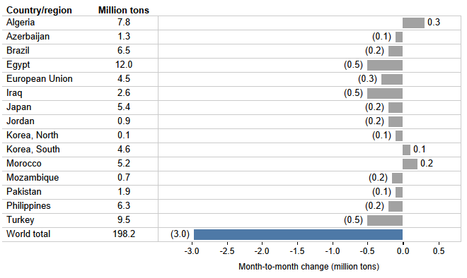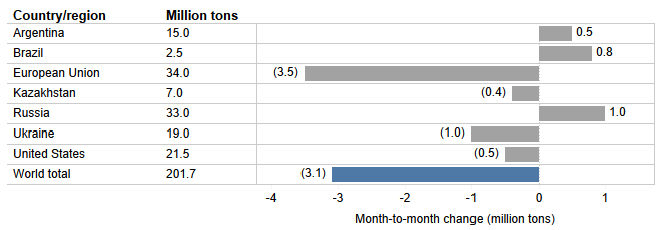 Глобальные конечные остатки скорректированы в сторону понижения на 3,1 млн тонн до 278,4 млн из-за сокращения для Индии, которое не полностью компенсировано увеличением конечных остатков основных экспортеров. Конечные остатки Индии пересмотрены в сторону уменьшения на 4,4 млн тонн до 21,0 млн, поскольку программы распределения продовольствия в стране привели к увеличению использования государственных запасов. Конечные остатки основных экспортеров пересмотрены в сторону увеличения на 2,3 млн тонн до 58,4 млн тонн. Сокращение экспорта для Европейского Союза, США и Украины обеспечивает рост конечных остатков основных экспортеров. Это частично нивелируется их снижением для России, поскольку она продолжает экспортировать. На рис. 6 изображена карта изменений конечных остатков по странам в этом месяце.