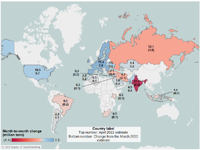 Рисунок 6. Месячное изменение конечных остатков пшеницы для 2021/22 года, апрель 2022.