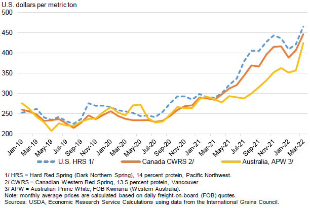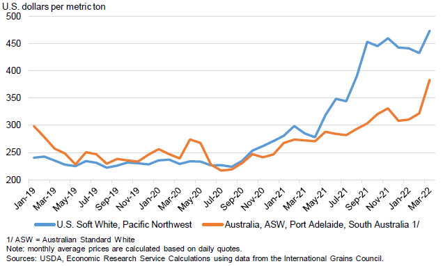 Цены на австралийскую пшеницу были очень конкурентоспособными на международном рынке в первой половине 2021 года из-за больших запасов, оставшихся после рекордного на тот момент урожая 2020/21 года. Австралия является ведущим в мире производителем белозерной пшеницы, но производит в основном твердую белозерную пшеницу, которая не полностью сопоставима с мягкой белозерной пшеницей, экспортируемой Соединенными Штатами. Ближе к концу 2021 года Австралия собрала еще один рекордно большой урожай, что еще больше способствовало конкурентному преимуществу, особенно при экспорте на близлежащие азиатские рынки.