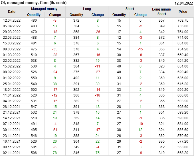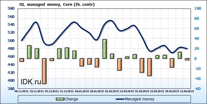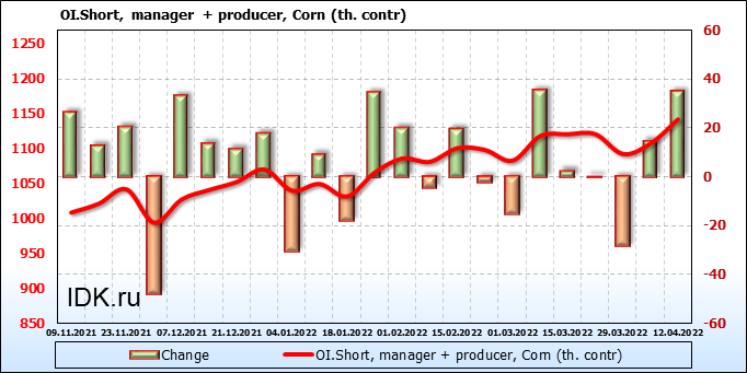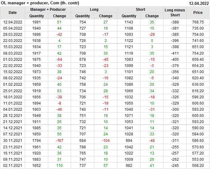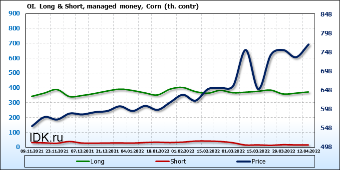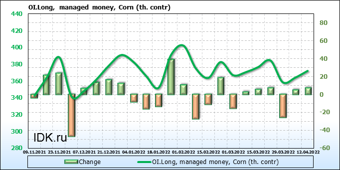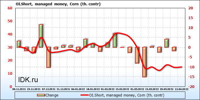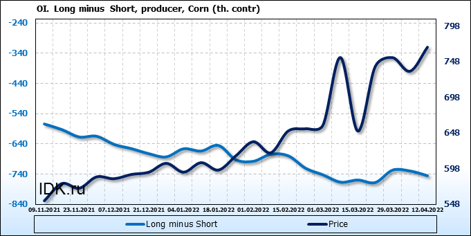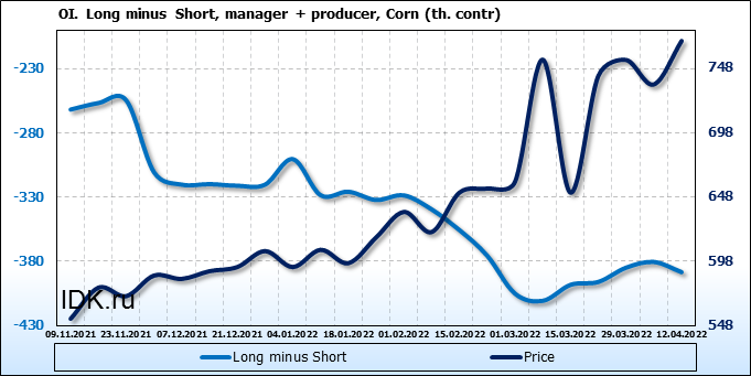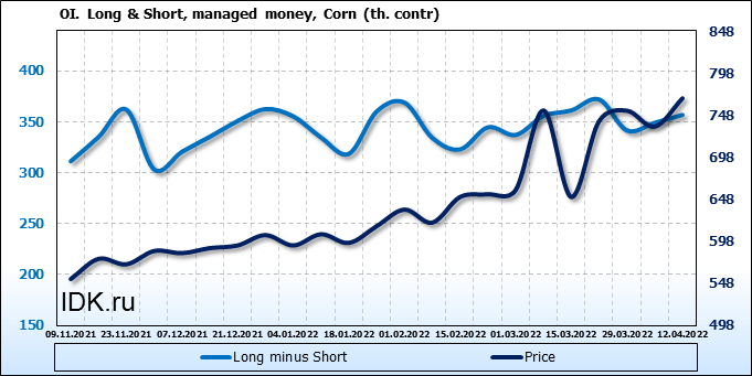 За прошлую неделю, 06.04.22 — 12.04.22, разница между длинными и короткими позициями управляющих увеличилась на 7.8 тыс. контрактов. В тоже время, цена выросла на 33.75 цента.