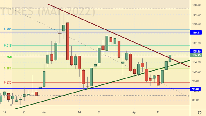 Сценарий роста: рассматриваем апрельский фьючерс, дата экспирации 29 апреля. Продолжим держать лонг от 103.00. В случае падения к 105.00 желающие могут войти в покупку.