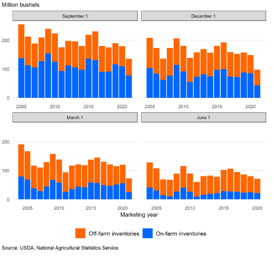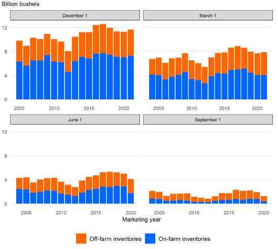 Национальная служба сельскохозяйственной статистики (NASS) опубликовала оценочные данные о запасах кукурузы на 1 марта в отчете о запасах зерна от 31 марта. Запасы кукурузы в Соединенных Штатах составили 7 850 миллионов бушелей, что немного ниже уровня предыдущего года в 7 969 миллионов бушелей. Сравнивая уровень запасов на 1 марта с показателем от 1 декабря, можно сказать, что общее потребление во втором квартале 2021/22 года было на 5 процентов выше, чем за тот же период 2020/21 года. Более высокие темпы потребления наблюдаются, несмотря на рост наличных цен в 2021/22 году, хотя текущий маркетинговый год характеризовался более высоким производством и предложением, чем в предыдущем году.