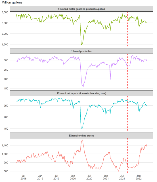 Рисунок 2. Еженедельные объемы поставок топлива, производства и остатков этанола в США.