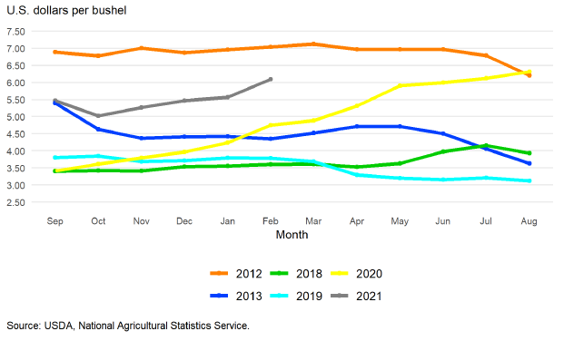 Прогноз средней сезонной цены на кукурузу в США в 2021/22 году составляет 5,80 доллара за бушель, что на 0,15 доллара больше, чем ожидалось в мартовском отчете. Прогноз роста цен основан на ежемесячных данных по конец февраля, согласно отчету NASS о ценах на сельскохозяйственную продукцию.