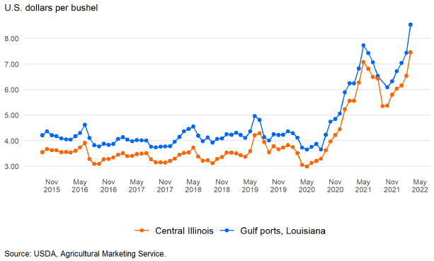 Наличные цены на кукурузу в Соединенных Штатах выросли после начала военной операции России в Украине, которая началась 24 февраля 2022 года. С тех пор мировые рынки зерна работают в условиях более высоких цен и демонстрируют повышенный уровень волатильности. Цены на кукурузу на экспортных терминалах Мексиканского залива в марте в среднем превышали 8,50 долларов за бушель. В то время как внутренние наличные цены также значительно выросли, существенные сдвиги в базисных уровнях показали, что процессы определения цен на рынках кукурузы были обусловлены фундаментальными факторами локального рынка.