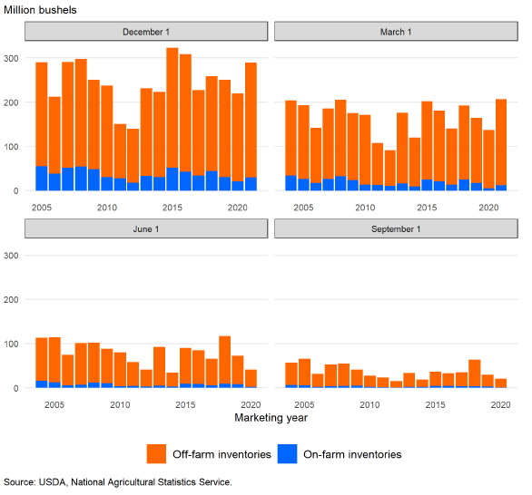 Рисунок 6. Запасы сорго в США поквартально, на фермах и вне ферм.