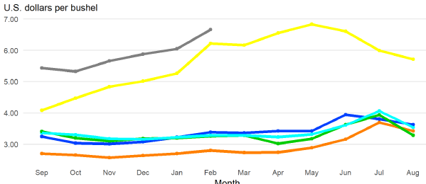 Прогнозируется, что средняя за сезон фермерская цена на сорго составит 5,85 доллара за бушель в 2021/22 году, что на 7% выше, чем в 2020/21 маркетинговом году. В последнем отчете NASS о ценах на сельскохозяйственную продукцию сообщается, что фермерская цена на сорго в стране увеличилась до 6,66 доллара за бушель в феврале 2022 года.