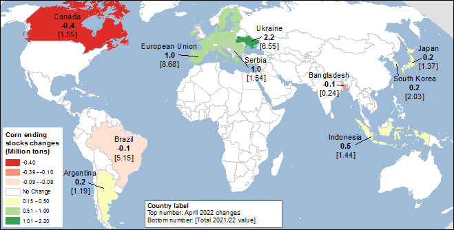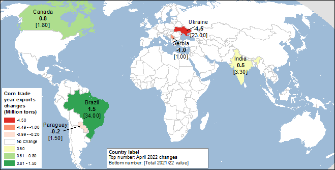 Поскольку рост мировых запасов кукурузы более чем компенсирует незначительное увеличение потребления, прогноз мировых конечных остатков кукурузы увеличивается. Прогноз мировых конечных остатков кукурузы на 2021/22 год повышен на 4,5 миллиона тонн по сравнению с мартовским отчетом до 305,5 миллиона. Около половины этого прироста — 2,2 млн тонн — приходится на Украину и еще 1,0 млн тонн на Сербию из-за запрета на экспорт кукурузы из Сербии. Множественные, частично компенсирующие друг друга изменения внесены в остатки ряда стран после изменений в производстве, потреблении и торговле. Изменения конечных остатков в этом месяце представлены на карте 4 ниже.