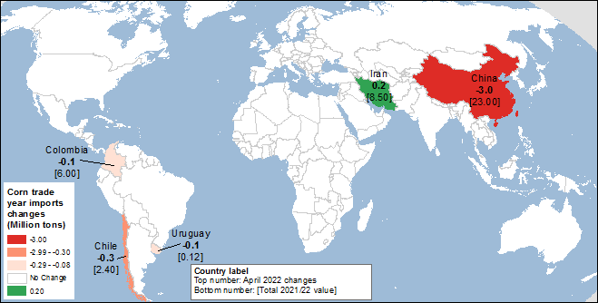 Карта 2. Основные изменения импорта кукурузы для 2021/22 торгового года (млн. тонн), апрель 2022.