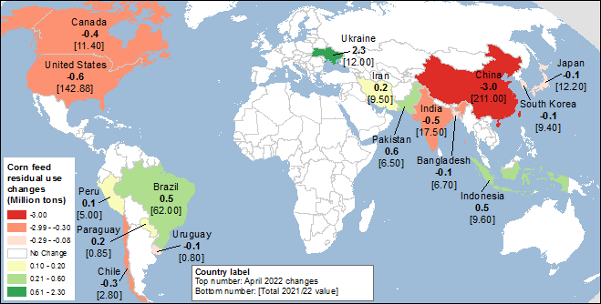 Основные изменения в кормовом и остаточном потреблении в этом месяце отражают связанное с военным конфликтом перераспределение торговли зерном и в значительной степени компенсируют друг друга. Снижение прогнозируемого экспорта означает, что в Украине останется больше кукурузы. Без каких-либо дополнительных сведений о масштабах уничтожения элеваторов и запасов кукурузы в Украине снова применяется предположение прошлого месяца: прогнозируется, что половина этого зерна не будет экспортироваться в будущем, так как некоторые запасы будут либо уничтожены, либо станут непригодными к использованию, увеличивая остаточную часть кормовой и остаточной категории потребления. Предполагается, что остальная часть этой кукурузы будет запасена и, вероятно, в будущем будет экспортироваться или потребляться внутри страны. С другой стороны, сокращение импорта кукурузы Китаем означает снижение кормового потребления кукурузы в этой стране, хотя оно по-прежнему остается рекордно высоким и на 4 процента превышает прошлогодний уровень. Кормовое и остаточное потребление кукурузы также пересмотрено для ряда стран. Изменения этого месяца наглядно представлены на карте 3 ниже.