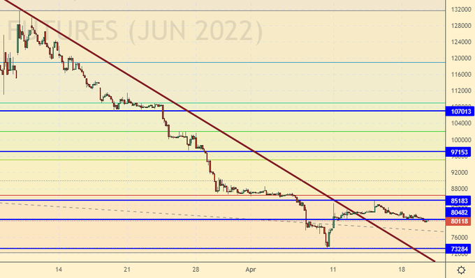 Продажа: нет. Кто в позиции от 100000, держите стоп на 101000. Цель: 80000 (50000).