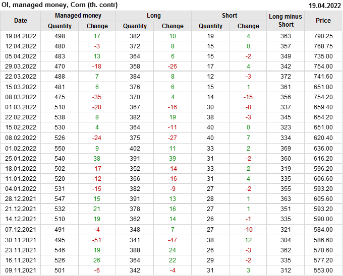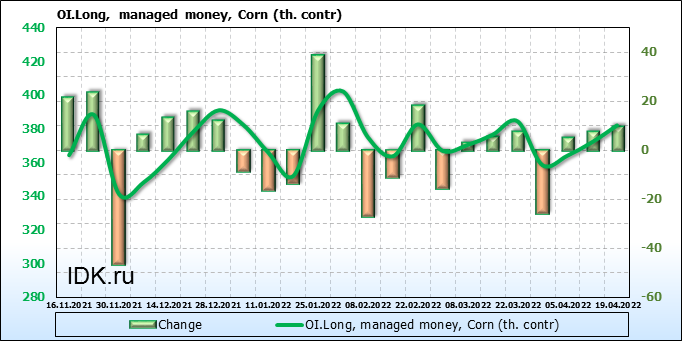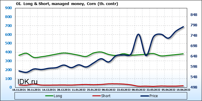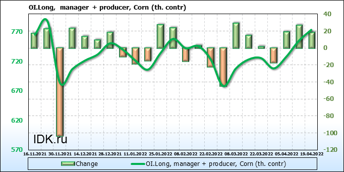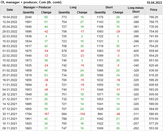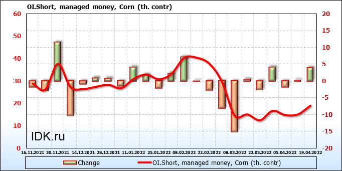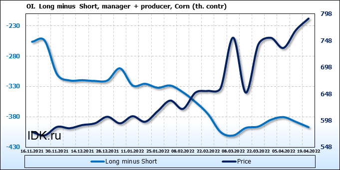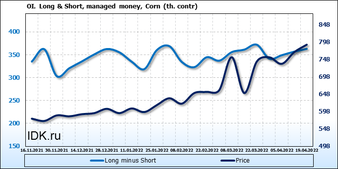 За прошлую неделю, 13.04.22 — 19.04.22, разница между длинными и короткими позициями управляющих увеличилась на 6 тыс. контрактов. В тоже время, цена выросла на 21.5 цента.