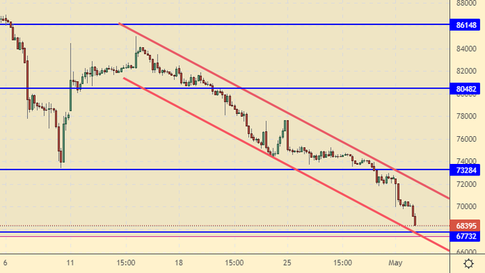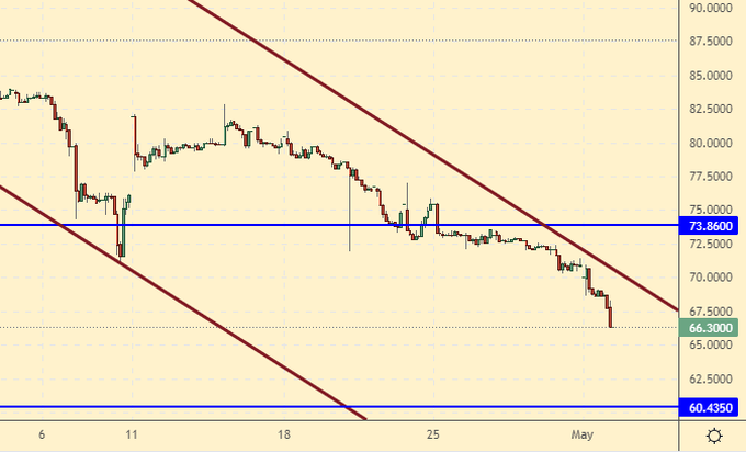 На фьючерсе видим, что возможна остановка в районе 67000. На спотовом рынке какие-либо уровни поддержки не просматриваются в принципе. Падение возможно вплоть до 52.00, что станет проблемой для правительства, так как траты будут только расти.