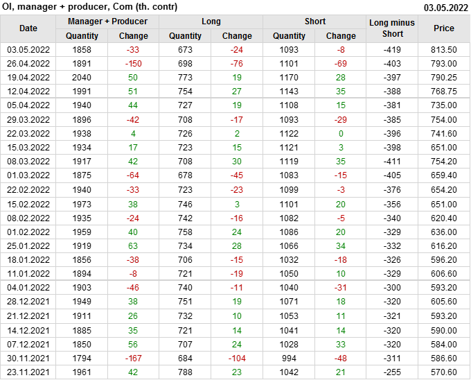 За прошлую неделю, 27.04.22 — 03.05.22, разница между длинными и короткими позициями управляющих сократилась на 10.8 тыс. контрактов. В тоже время, цена выросла на 20.5 цента.