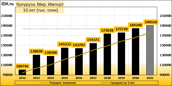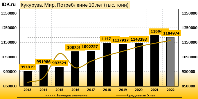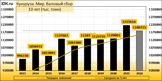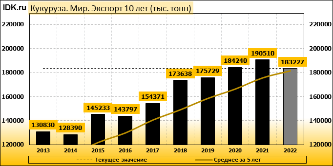 Валовый сбор: майская оценка сезона 22/23 составляет 1180715 тысяч тонн. Потребление: оценивается в 1184974 тысячи тонн. Экспорт: оценивается в 183227 тысяч тонн. Импорт: составит 183227 тысяч тонн. Конечные запасы: составят 305128 тысяч тонн.