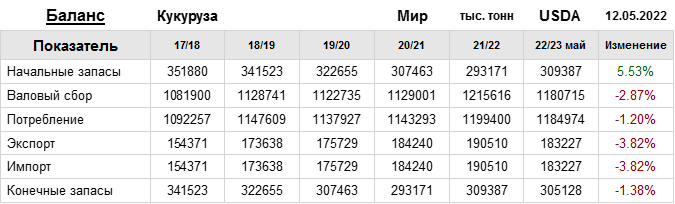 За прошедший месяц министерство сельского хозяйства США (USDA) на 12.05.2022 пересмотрело Баланс кукурузы для Мира в сезоне 22/23 следующим образом: