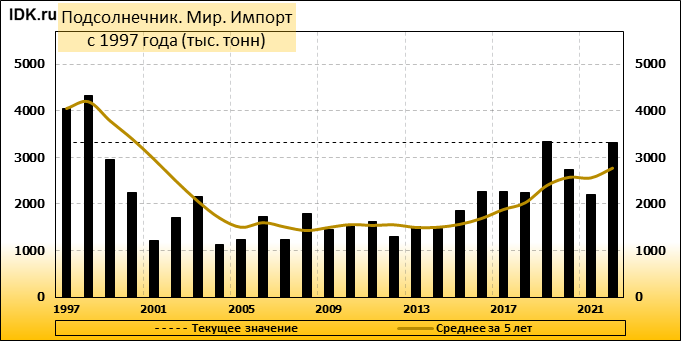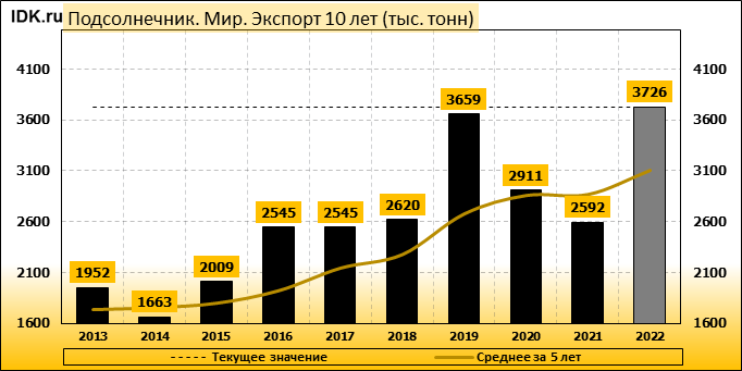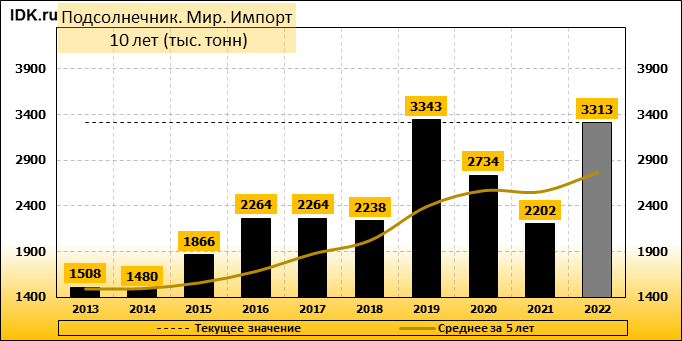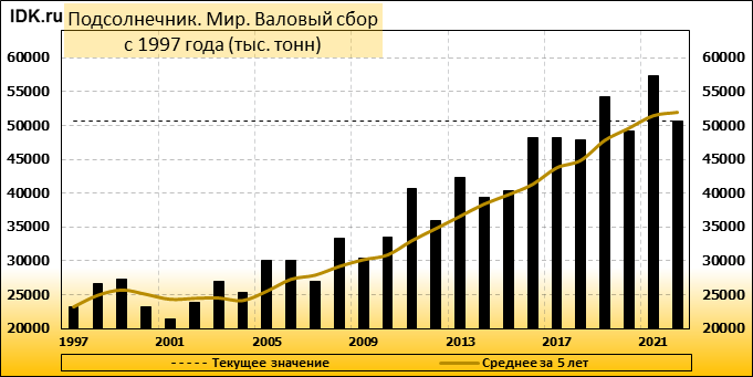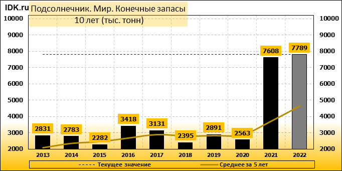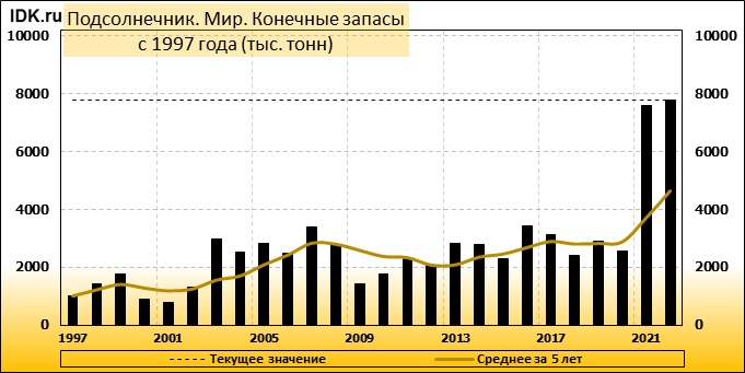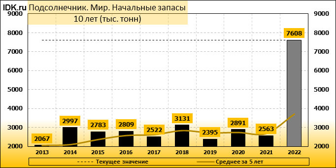 Согласно майскому отчету МСХ США, мировое производство подсолнечника в 2022/23 году сократится на 6,66 млн. тонн или 11,60 процентов по сравнению с предыдущим годом до 50,72 млн. тонн. Большая часть сокращения приходится на Украину, прогноз для которой снижен на 6,50 млн. тонн до 11,00 млн. тонн. Сокращение прогноза частично компенсируется повышением производства в Аргентине на 0,85 млн. тонн до 4,20 млн. тонн и в США – на 0,20 млн. тонн до 1,06 млн. тонн. Ожидается, что мировые конечные остатки подсолнечника вырастут до 7,8 млн тонн в 2022/23 году с 7,6 млн. тонн в 2021/22 году.