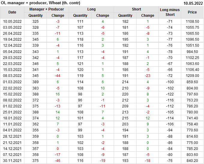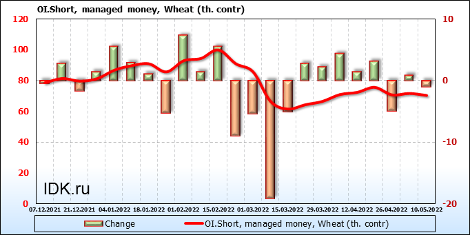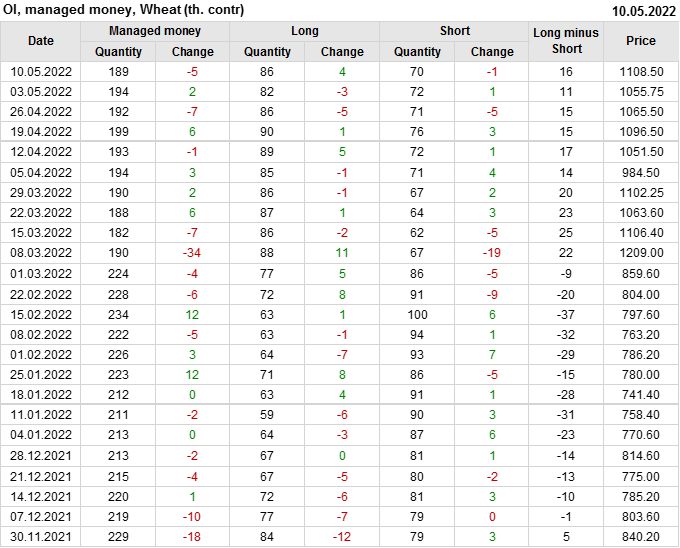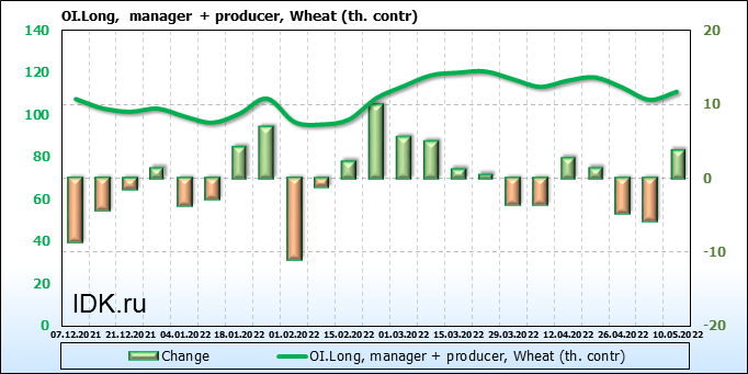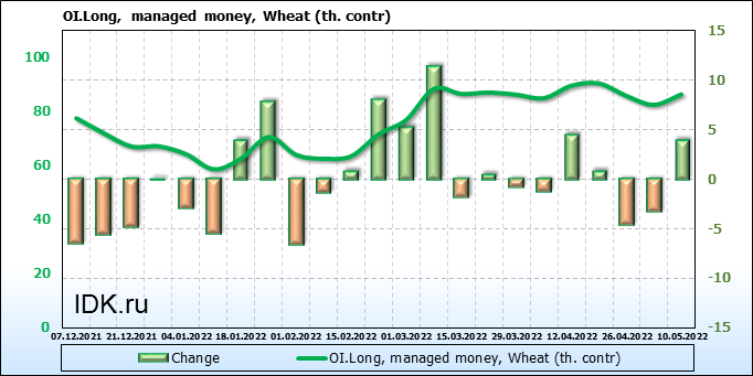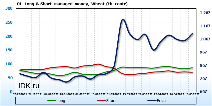 За прошедшую неделю, 04.05.22 — 10.05.22, разница между длинными и короткими позициями управляющих увеличилась на 5.2 тыс. контрактов. В тоже время, цена выросла на 52.75 цента.