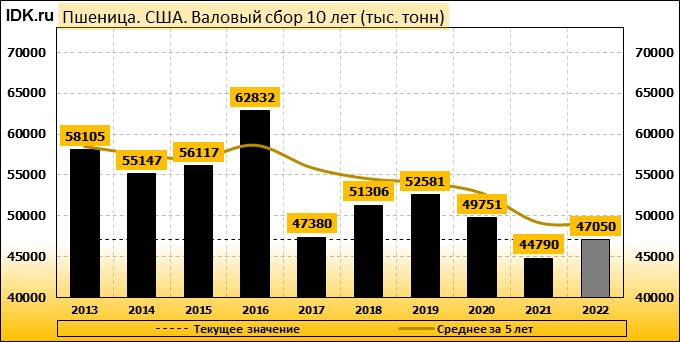 Прогноз для рынка пшеницы в США на 2022/23 год связан с сокращением запасов, экспорта, внутреннего потребления и повышением цен. Прогнозируется, что запасы пшеницы в США в 2022/23 году сократятся на 3 процента, поскольку более низкие начальные запасы нивелируют увеличение урожая. Производство пшеницы в 2022/23 году прогнозируется на уровне 1 729 миллионов бушелей, что на 83 миллиона больше, чем в прошлом году, поскольку более высокая урожайность более чем компенсирует небольшое сокращение посевных площадей. Экспорт прогнозируется на уровне 775 миллионов бушелей, что будет самым низким уровнем с 1971/72 года.