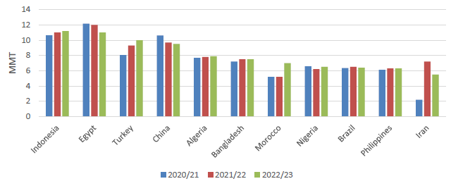 Прогнозируется, что мировая торговля достигнет рекордного уровня, при этом импорт будет расти как в Северной Африке, так и в странах Африки к югу от Сахары по мере роста населения и потребления, но производство останется относительно неизменным. Индонезия станет крупнейшим импортером, чему способствует расширение потребления пшеницы для продовольственных целей в стране. Прогнозируется, что Египет, который играл заметную роль с 2007/08 гг., сократит импорт при более высоком урожае, поскольку правительство стремится достичь большей самообеспеченности. Турция продолжает быть крупным импортером пшеницы и экспортером продуктов из пшеницы, и в следующем году ожидается рост обоих показателей. Прогнозируется, что Китай третий год подряд будет иметь крупный импорт, хотя и немного меньший, чем в текущем году, что компенсирует меньший урожай и сокращение начальных запасов. Наибольший рост импорта придется на Марокко, которому потребуются большие объемы, чтобы компенсировать самый низкий урожай с 2007/08 года. Наибольшее годовое снижение импорта ожидается для Ирана, который соберет более крупный урожай.