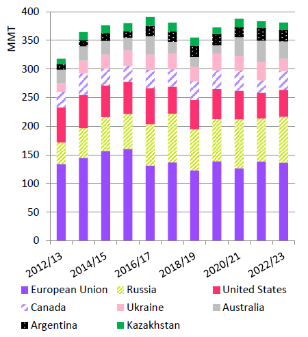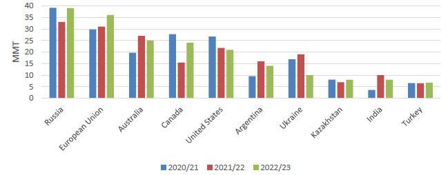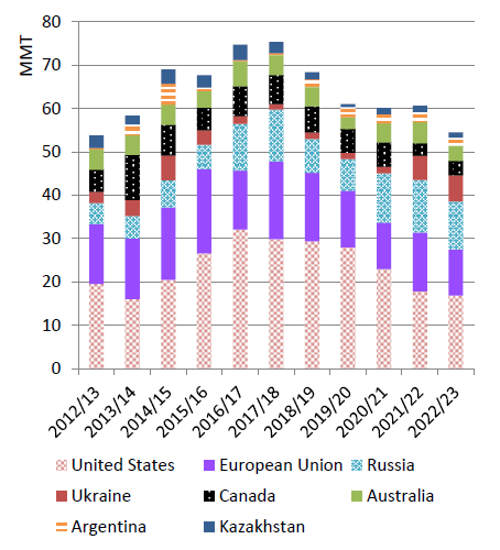 Прогнозируется, что мировой экспорт составит рекордные 205 миллионов тонн, поскольку ожидается, что устойчивый спрос на импорт и высокие цены заставят крупных экспортеров отдавать приоритет экспортным поставкам. Прогнозируется, что Россия станет крупнейшим экспортером третий год подряд благодаря увеличению урожая и высокому мировому спросу на доступную черноморскую пшеницу, поскольку экспорт из Украины ограничен. В настоящее время Украина не может экспортировать через морские порты из-за продолжающейся войны, но стремится использовать альтернативные маршруты, прежде всего по железной дороге и экспорт через соседние европейские страны. Согласно прогнозам, Европейский Союз станет вторым по величине экспортером, что отражает более высокий урожай во Франции, Румынии и Германии, а также растущий спрос со стороны стран Африки к югу от Сахары и Ближнего Востока. Прогнозируется значительное снижение экспорта Австралии; однако, если прогноз будет реализован, это все равно будет вторым по величине экспортом за всю историю, в ответ на высокий спрос на рынках Юго-Восточной Азии. Экспорт США, по прогнозам, снизится, поскольку ожидается, что несколько крупных экспортеров будут иметь более крупное предложение в 2022/23 году, и относительно высокие цены снизят конкурентоспособность США. Прогнозируется, что Канада покажет наибольший рост экспорта год к году, поскольку гораздо более крупный урожай и высокий мировой спрос на твердую пшеницу стимулируют рост поставок. Прогнозируется, что экспорт Аргентины сократится из-за меньшего урожая и более сильной конкуренции со стороны Северной Америки. Прогнозируется, что Казахстан увеличит экспорт из-за высокого спроса со стороны Центральной Азии на пшеницу и пшеничную муку. Прогнозируется, что у Индии будет еще один год сильного экспорта при сохранении конкурентоспособности в регионе и достаточном количестве запасов.