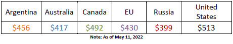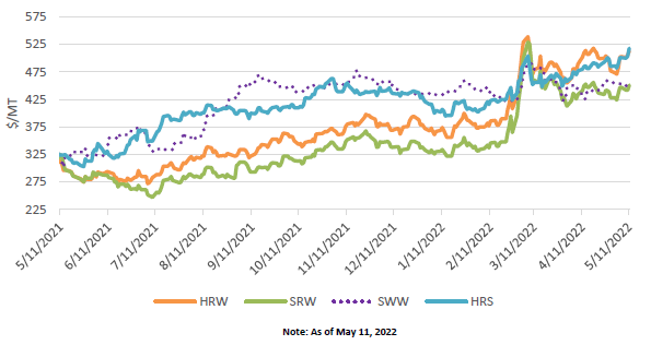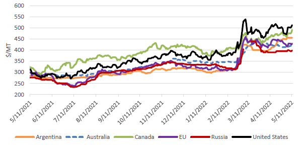 Цены на американскую озимую пшеницу выросли с момента публикации апрельского отчета WASDE, поскольку доля озимой пшеницы в США, получившей оценку «хорошо/отлично» составила всего 29%, согласно последним рейтингам состояния посевов NASS. Нынешние условия, вероятно, ограничивают потенциал значительного улучшения урожая в регионе Южных равнин. Hard Red Winter (HRW) подорожала на 27 долларов за тонну до 503 долларов из-за дефицита дождей в Оклахоме. Soft Red Winter (SRW) также выросла на 21 доллар за тонну до 447 долларов из-за сухих условий выращивания. Цены на Hard Red Spring (HRS) выросли на 31 доллар за тонну до 501 доллара, поскольку прогресс посева яровой пшеницы в настоящее время вдвое меньше, чем за тот же период год назад. Soft White Winter (SWW) подешевела на 1 доллар за тонну до 450 долларов из-за слабого международного спроса.