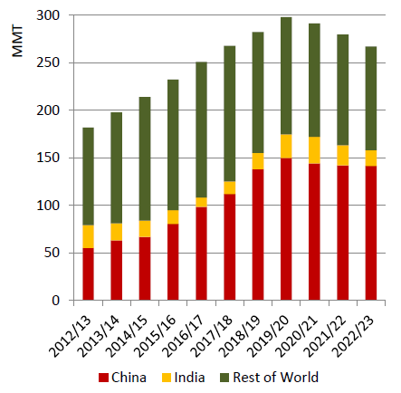 Китай является крупнейшим держателем запасов пшеницы в мире, хотя они в основном недоступны для мировых рынков. Запасы Китая резко выросли в период с 2012/13 по 2019/20 год из-за государственных закупок для создания резервов. Продажи с государственных аукционов как кормового, так и продовольственного зерна, начиная с 2020/21 года, привели к сокращению запасов, которое, как ожидается, продолжится в 2022/23 году. Прогнозируется, что остатки в Индии, втором по величине держателе мировых запасов, сократятся, поскольку рыночные цены, предлагаемые экспортерами, в значительной степени превышают цены государственных закупок. Ожидается, что, несмотря на сокращение потребления, уменьшение урожая и активный экспорт приведут к снижению остатков, хотя они все еще превышают желаемый правительством буферный уровень.