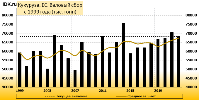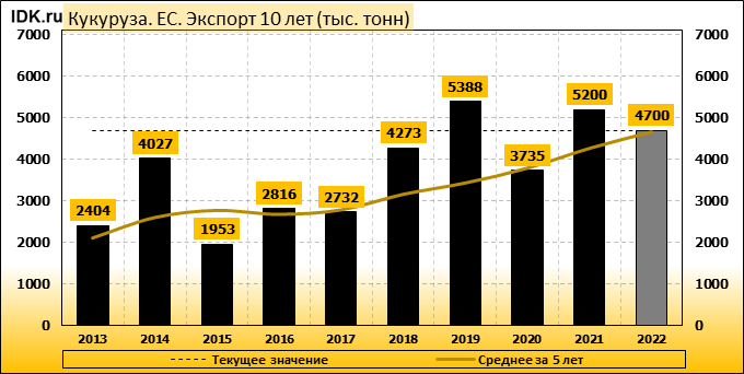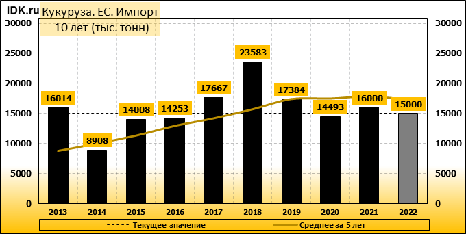 Производство кукурузы в Европейском союзе (ЕС) в 2022/23 маркетинговом году прогнозируется на уровне 68,25 млн метрических тонн, что на 2,25 млн тонн или 3,2 процента меньше пересмотренной оценки на 2021/22 МГ. Урожайность прогнозируется на уровне 7,53 тонны с гектара, что на 1,5 процента меньше, чем в предыдущем году. Уборочная площадь прогнозируется на уровне 9,07 млн га, по сравнению с 9,21 млн га в прошлом году. Импорт кукурузы в ЕС в 2022/23 маркетинговом году сократится на 1 млн тонн до 15 млн тонн из-за сокращения кормового спроса на кукурузу на фоне роста цен.