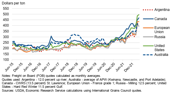 Прогнозируется, что Россия станет ведущим экспортером в 2022/23 году с объемом 39,0 млн тонн. Она по-прежнему конкурентоспособна по цене по сравнению с другими крупными экспортерами (рис. 10). Ожидается, что ЕС экспортирует в 2022/23 году больше по сравнению с прошлым годом, поскольку он располагает запасами, необходимыми для компенсации потери украинской пшеницы. Прогнозируется, что в связи с ожидаемым ростом производства Канада увеличит свой экспорт до 24,0 млн тонн, что ниже рекордного показателя 2020/21 года (27,7 млн тонн). Экспорт из Украины останется низким из-за закрытия портов в связи с конфликтом и снижения производства. Ожидается, что из-за снижения внутреннего производства Австралия, Индия и Аргентина сократят экспорт в 2022/23 году.