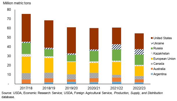 Прогнозируется, что мировое производство пшеницы в 2022/23 году будет ниже рекордного уровня 2021/22 года и составит 774,8 млн метрических тонн. В то время как производство Канады и России, по прогнозам, восстановится после снижения в 2021/22 году, урожай в Украине и Австралии, по прогнозам, будет ниже уровня 2021/22 года. По прогнозам, Соединенные Штаты также восстановятся после прошлогоднего снижения производства яровой пшеницы из-за засухи. На Рисунке 8 показаны топ-20 ведущих стран-производителей в 2022/23 году и их изменения по сравнению с предыдущим годом.