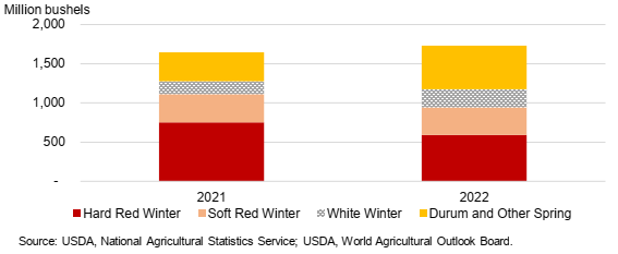 Рисунок 2. Производство пшеницы в США по классам, 2021 и 2022 гг.