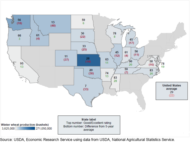 Наиболее существенное падение урожайности по сравнению с предыдущим годом приходится, прежде всего, на основные штаты-производители HRW. Статистические данные USDA и NASS о состоянии посевов содержат аналогичную информацию, показывая, что рейтинг «хорошо/отлично» для ключевых штатов-производителей HRW — Канзаса, Оклахомы и Техаса – значительно ниже их средних значений за 5 лет (рис. 4). Согласно анализу Министерства сельского хозяйства США и данным U.S. Drought Monitor, 68 процентов производства озимой пшеницы в США приходится на районы, переживающие засуху по состоянию на 10 мая 2022 года. Это немного меньше, чем 69 процентов в начале апреля, но значительно выше 34 процентов, о которых сообщалось 11 мая 2021 г. Большая часть производства твердой пшеницы (76 процентов) приходится на засушливые регионы, в то время как только 35 процентов производства прочей яровой пшеницы приходится на засушливые районы.