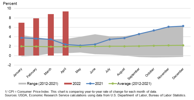 Инфляция потребительских цен на продовольствие была существенной в течение нескольких месяцев, при этом индекс потребительских цен (CPI) в апреле продемонстрировал значительный рост год к году для многих ключевых групп продуктов. На рисунке 6 показаны ежемесячные данные CPI для всей категории продовольственных товаров. В целом категория продовольственных товаров показывает рост более чем на 9 процентов по сравнению с апрелем прошлого года. На рисунке 7 показан рост индекса цен на зерновые и продукты их переработки, который в апреле составил 12 процентов по сравнению с предыдущим годом. По всей категории многие из составляющих этого индекса также демонстрируют сильный рост с 2021 года. Кроме того, росту стоимости продуктов на основе пшеницы способствует также удорожание некоторых других ингредиентов, таких как масло растительное и сливочное, а также сахар.