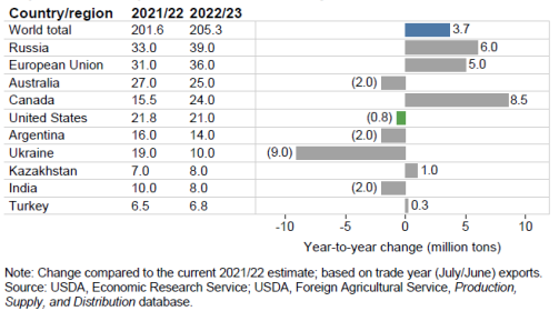 Несмотря на высокие цены на пшеницу, высокий потребительский спрос приводит к увеличению импорта в 2022/23 торговом году (июль/июнь) до рекордных 201,2 млн тонн, что на 3,7 млн больше, чем в предыдущем году. Прогнозируется, что экспорт в 2022/23 торговом году составит рекордные 205,3 млн тонн, что на 3,7 млн больше, чем в 2021/22 году. На Рисунке 9 показаны 10 ведущих экспортеров в 2022/23 торговом году (июль/июнь) и соответствующие изменения торговли по сравнению с предыдущим годом.