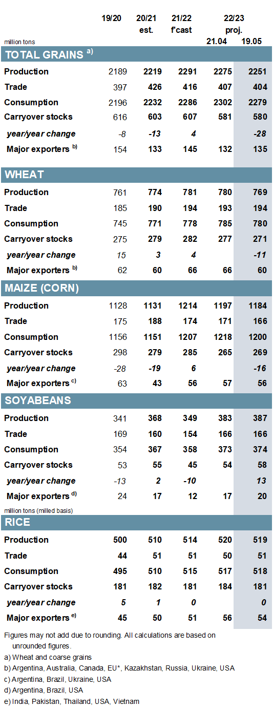 С учетом значительного сокращения производства кукурузы и пшеницы прогноз мирового производства зерна в 2022/23 году на 24 млн тонн ниже апрельского отчета. При снижении прогнозируемого потребления почти на такую же величину оценка мирового объема переходящих запасов снизилась на 1 млн тонн. В основном из-за сокращения прогноза для кукурузы общий объем торговли снижен на 3 млн тонн, до 404 млн, что означает второе подряд снижение год к году.