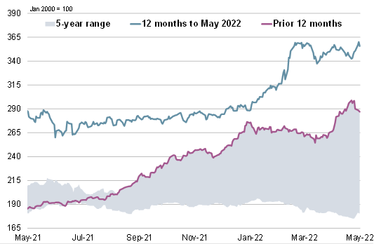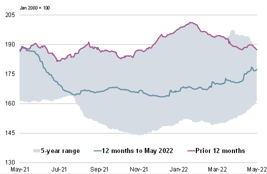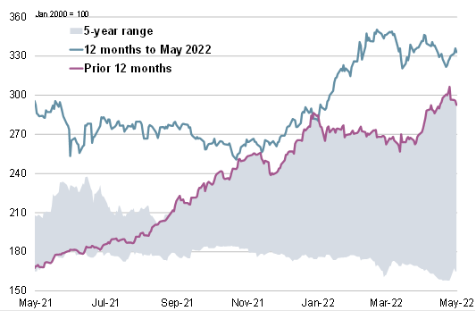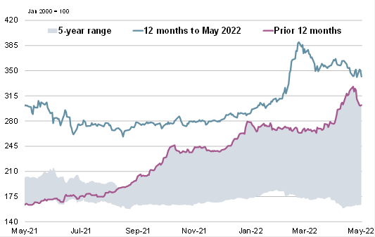 При смешанных тенденциях среди основных компонентов индекс GOI IGC немного снизился по сравнению с прошлым месяцем, хотя он все еще почти на четверть выше, чем год назад.