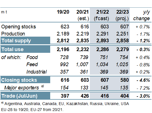Благодаря рекордным урожаям кукурузы и ячменя общий объем производства зерна, по прогнозам, вырастет на 3% и составит 2 291 млн тонн. В то время как потребление также будет расти, с приростом продовольственного (+2%), кормового (+3%) и промышленного (+2%) потребления, общий его рост на 2% будет немного отставать от предложения, что приведет небольшому увеличению переходящих запасов до 607 млн тонн (+1%). Прогнозируется, что мировая торговля сократится на 2%, до 416 млн тонн, частично из-за продолжающегося ограничения поставок из Украины.