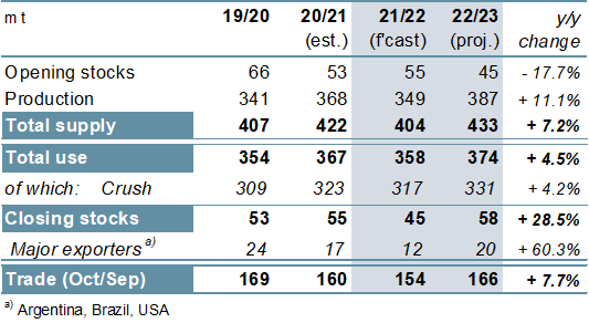 Ожидается, что мировое производство сои в 2021/22 году сократится на 5% по сравнению с предыдущим годом до 349 млн тонн из-за падения производства в Южной Америке. В связи с этим сокращением, которое привело к снижению запасов, потребление и остатки должны также сократиться, последние на 18% год к году. Прогнозируется, что мировое производство в 2022/23 году резко вырастет до рекордных 387 млн тонн (+11%) за счет потенциально высоких урожаев у трех основных производителей. Прогнозируется, что потребление увеличится в связи с ростом спроса на соевые продукты в кормовом, пищевом и промышленном секторах, в то время как остатки могут накапливаться. Ожидается, что торговля вырастет на 8% в годовом исчислении за счет более крупных поставок в Азию, Европу, Африку и Америку.