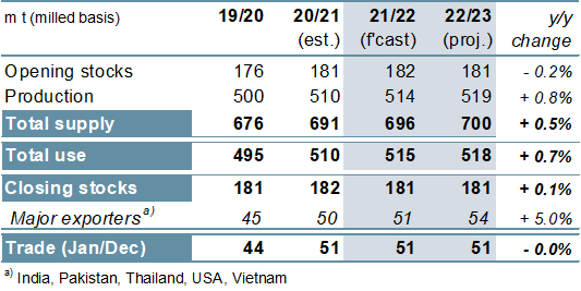 Ожидается, что мировая торговля рисом достигнет пика в 2022 году благодаря крупным поставкам в Африку. Прогнозируется, что глобальное производство вырастет на 1% в 2022/23 году до рекордного уровня в связи с увеличением посевных площадей в Азии. Поддерживаемый ростом населения, продовольственный спрос подталкивает потребление к новому максимуму, при этом кормовое потребление также вносит свой вклад. С ростом показателей у основных экспортеров, компенсирующих сокращение в других странах, мировые переходящие остатки мало изменились по сравнению с прошлым годом. Мировая торговля в 2023 г. прогнозируется стабильной на уровне 51 млн тонн, при этом ожидаются крупные закупки со стороны африканских импортеров и Китая.