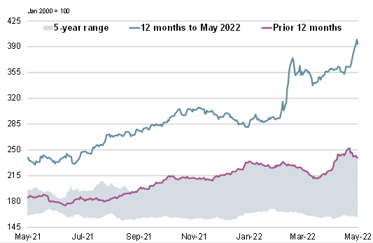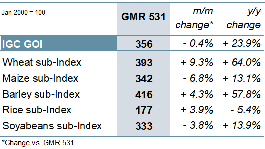 После того, как опасения по поводу глобальных экспортных запасов усугубились недавним объявлением Индии о запрете экспорта, субиндекс IGC GOI пшеницы подскочил до 14-летнего максимума, увеличившись на 9% по сравнению с прошлым месяцем.