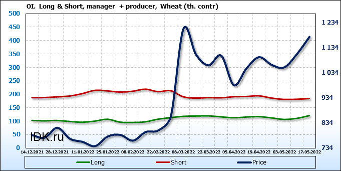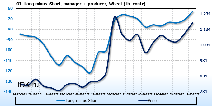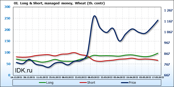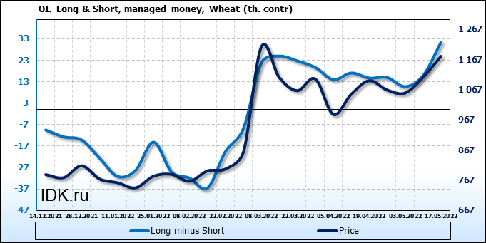 За прошедшую неделю, 11.05.22 — 17.05.22, разница между длинными и короткими позициями управляющих увеличилась на 15.5 тыс. контрактов. В тоже время, цена выросла на 69 центов.