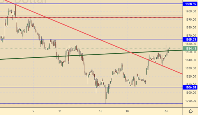 Пока мы ниже 1865 имеет смысл продавать. Не исключен проход к 1890, но в этом случае мы увидим на рынке равновесие, а пока мы под 1865 преимущество остается за продавцами. Отметим, если падение на фондовом рынке США продолжится золото получит поддержку, так как деньги будут искать для себя убежище.