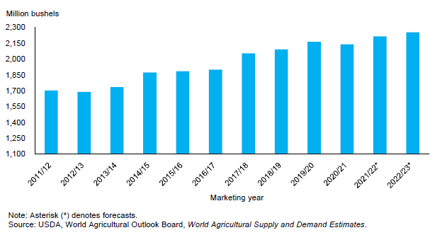 Несмотря на высокий уровень по историческим меркам, валовая маржа переработки сои, по прогнозам, снизится в 2022/23 году. Это будет способствовать увеличению объемов переработки сои, которые, как ожидается, достигнут 2 255 млн бушелей в 2022/23 году, что на 40 млн бушелей больше, чем в 2021/22 году. Ожидается, что в дополнение к увеличению внутреннего потребления сои экспорт превысит оценку 2021/22 года на 60 миллионов бушелей до 2 200 миллионов.