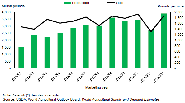 С 2021/22 по 2022/23 год мало что изменилось в отношении намерений США по посевам канолы; однако ожидается, что перспективы урожайности восстановятся после засушливых условий, которые повлияли на урожай прошлого года. При нормальных погодных условиях урожайность канолы на 2022/23 год прогнозируется на уровне 1 875 фунтов с акра. Увеличение урожайности на 573 фунта с акра повысит внутреннее производство канолы почти на 1 185 миллионов фунтов по сравнению с предыдущим годом до 3 905 миллионов. Ожидается, что производство канолы в Канаде также вырастет в 2022/23 году, что позволит США пополнить запасы за счет увеличения импорта канолы. Ожидается, что США увеличат импорт канолы в 2022/23 году на 260 миллионов фунтов до 1 157 миллионов.