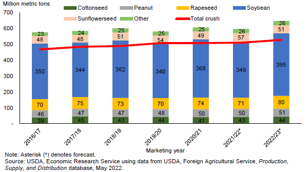 Прогнозируется рост мирового производства также других масличных культур. В частности, ожидается, что мировое производство канолы вырастет на 9,14 млн тонн, достигнув 80,32 млн тонн, а производство хлопка увеличится на 1,33 млн тонн до 44,07 млн тонн. Ожидается, что мировое производство подсолнечника снизится на 6,66 млн до 50,72 млн тонн из-за сокращения производства в Украине. Ожидается, что глобальный объем переработки масличных культур увеличится на 17,74 млн тонн до 528,05 млн тонн, причем на сою придется 74% этого увеличения. Несмотря на рост спроса во главе с Китаем, мировые конечные остатки масличных культур, как ожидается, составят 119,06 млн тонн, что на 15,9 млн тонн выше прогноза конечных остатков на 2021/22 год. Прогнозируется, что мировое потребление протеинового шрота вырастет почти на 3 процента в 2022/23 году и достигнет 354,91 миллиона тонн при основном вкладе со стороны Китая. Прогнозируется, что мировое потребление растительного масла вырастет более чем на 2 процента в 2022/23 году, в первую очередь за счет роста в Китае и Индии.